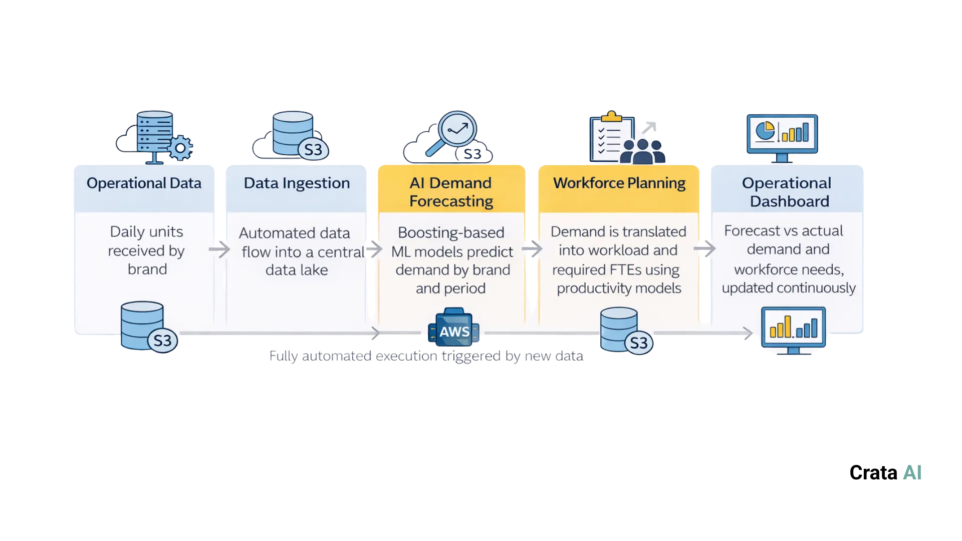 Para abordar este reto, desde Crata AI diseñamos una solución que combina previsión de demanda con IA y planificación operativa, pensada para integrarse en el día a día del equipo.